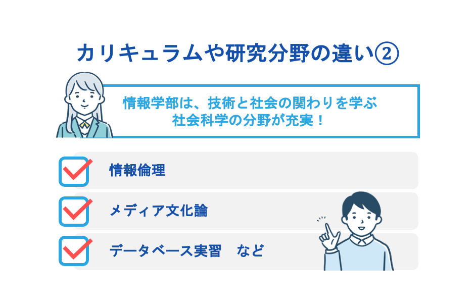 カリキュラムの違いとは、情報学部は「社会・倫理との接点+IT実習」、工学部は「数学・物理の理論+実装演習」が中核という点です。